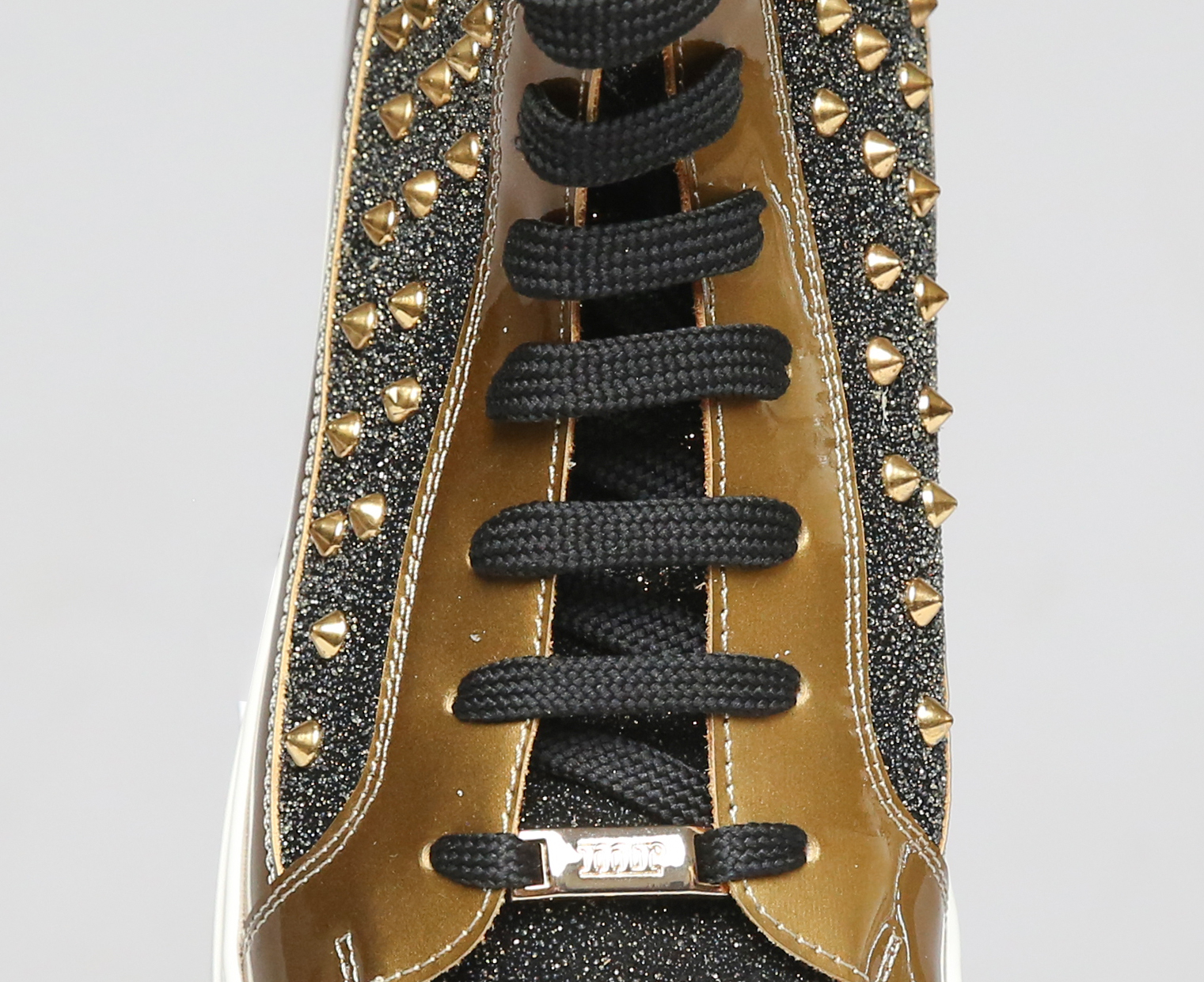 Gold-schwarzer, knöchelhoher Herrensneaker. Obermaterial aus goldenem Lackleder mit schwarzem Glitzer und goldfarbenen Nieten. Gepolsterter Kragen. Weiches Kalbslederfutter. Herausnehmbare Lederinnensohle, die durch eine eigene ersetzt werden kann. Weiße PU-Laufsohle.